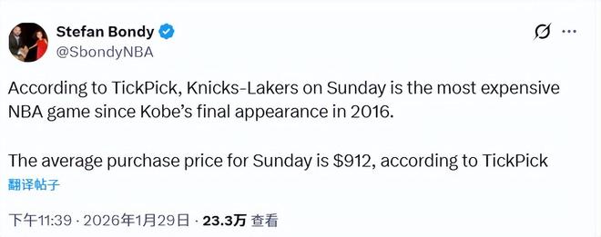 据票务平台Gametime的数据显示,湖人和尼克斯这场比赛的平均票价已高达912美元,这是自2016年4月13日科比退役之战(当时平均票价为1049美元)以来,NBA常规赛票价的最高纪录。而这场比赛的最低入场票价也达到了457美元。