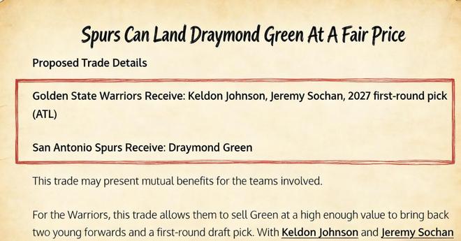 美媒《Fadeaway World》撰文提出了一套交易方案,他们建议勇士将格林送到马刺,换回凯尔登、索汉以及一个2027年的首轮签。