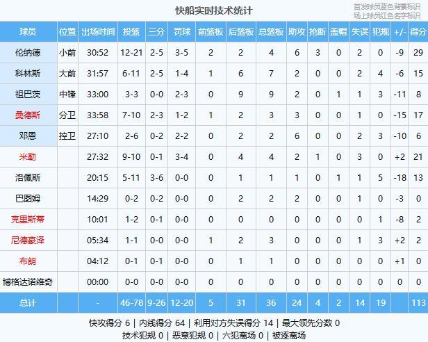 快船:伦纳德29分4板6助3断、米勒21分4板2助、桑德斯17分3板3助、科林斯15分7板2助、洛佩斯13分1板1助、祖巴茨8分9板2助、邓恩6分2板6助、尼德豪泽2分3板