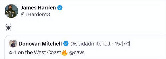 哈登在末节10分钟里得到6分4篮板4助攻。过去两场比赛,骑士第四节的进攻效率高达142.0。赛后,哈登转发了米切尔的庆祝胜利的社媒,配上了蜘蛛的表情,而那正是米切尔外号(蜘蛛侠)的标志。