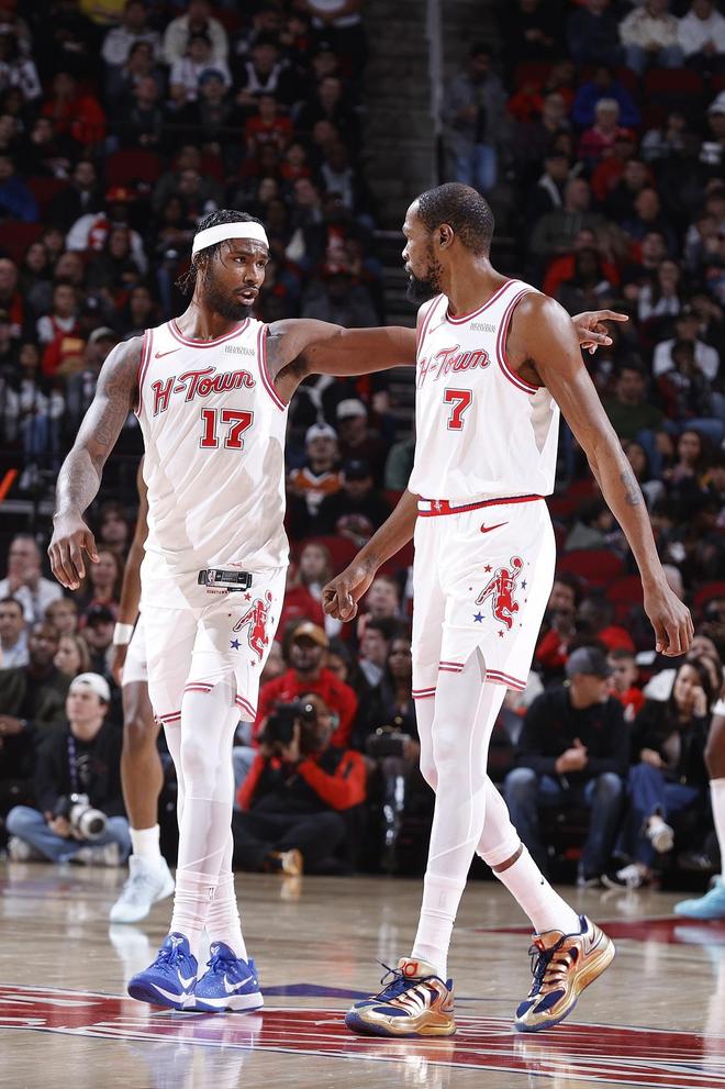 火箭队另外的4位首发分别是伊森、杜兰特、小史密斯和申京。除了伊森10投2中表现不佳之外,其余的三位球员全部得分上双:杜兰特得到26分和6个篮板、3次助攻;申京拿到22分、9个篮板和5次助攻,表现全面;小史密斯也砍下了13分和10个篮板的两双数据,他的正负值也是全队最高。