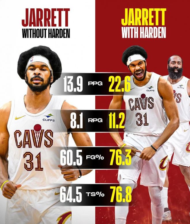 而阿伦,可谓是哈登加盟后的最大获益者。数据不会说谎,哈登加盟骑士前,阿伦场均13.9分8.1板,命中率60.5%,而哈登来了以后,哈登数据直接上涨到22.6分11.2板,投篮命中率76.3%!这是什么概念,命中率、产量,都是直线上升啊!可以说,阿伦之前是正儿八经的蓝领,而如今,已经完全变成高级货了,甚至打成“核武器”了!