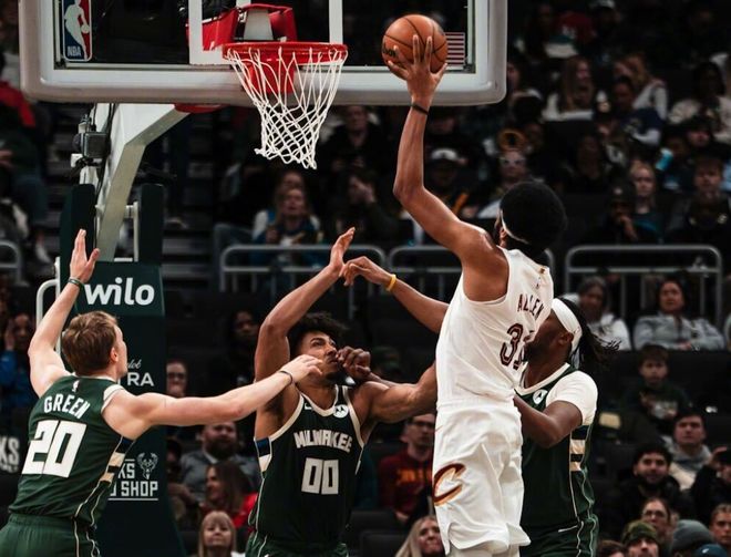 两队维持10分左右差距僵持几分钟,阿伦暴扣吹响反扑号角,施罗德抢断反击,随后助攻托布强攻,加上埃利斯的三分球,骑士一波10-0追到只差2分。波蒂斯又进三分球,节末托布和埃利斯扛起进攻大旗,三节打完,骑士94-93反超雄鹿。决战第四节,埃利斯和托布继续上分,AJ格林和希姆斯带队反超,阿伦勾手+造犯规重新拿回领先优势。最后5分钟,两队比分交替上升,施罗德关键两罚追平,罗林斯连拿4分。泰森罚球命中后,施罗德高难度抛投追平!最后1分钟,小波特后仰跳投,施罗德打铁,阿伦勾手压哨打进!