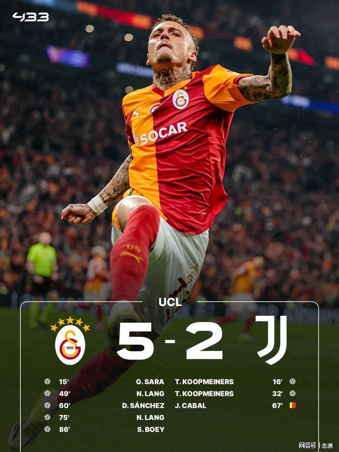尤文图斯客场2-5不敌加拉塔萨雷,两队次回合比赛将在北京时间2月26日移师安联球场开战。萨拉为加拉塔萨雷先拔头筹,库普梅纳斯梅开二度反超,诺阿-朗和桑切斯先后进球,卡巴尔连吃两黄被罚下,诺阿-朗和替补出场的博伊进球锁定胜局。