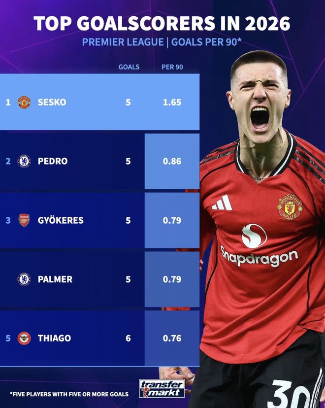 进入2026年,谢什科也是逐渐找回了状态,成了老特拉福德表现最好的球员之一:对阵伯恩利,他首发登场并梅开二度,打破了自己持续近三个月的进球荒,对阵布莱顿,他的进球让曼联将悬念保持到了最后时刻,对阵富勒姆,他替补登场打入绝杀球,对阵西汉姆联,他的巧射让曼联在最后时刻扳平了比分,在对阵埃弗顿打入制胜球之后,这位斯洛文尼亚前锋在近7场比赛已经轰入6球,英超赛场上每54分钟就能打入1球,效率已无需多言。当然了,他的抽象时刻一直不算少,像是对阵埃弗顿的比赛,谢什科在最后时刻拿到了单刀的机会,但面对皮克福德,谢什科的第一脚触球并不算好,单刀球被英格兰人奋力破坏,错失了梅开二度的机会。