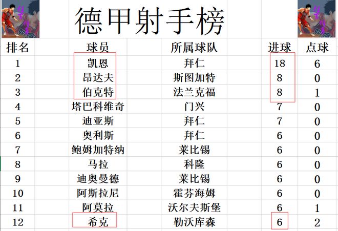射手榜方面,凯恩18球遥遥领先,昂达夫,伯克特差了10球之多并列第2。迪亚斯,塔巴科维奇7球并列第4,希克今天打入一球后,追上奥利斯,鲍姆加特纳等人6球刚好挤入前十。