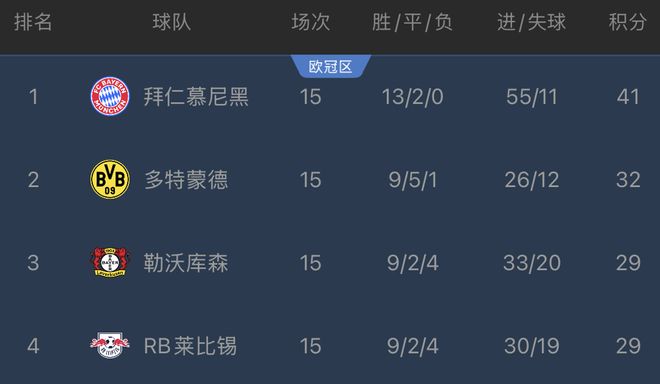 最后再来看德甲,拜仁在第15轮客场作战以4-0大胜海登海姆,本场过后,拜仁15轮13胜2平积41分,排名德甲榜首,多特32分,勒沃库森、莱比锡29分,排名2-4位。显然,在本赛季五大联赛中拜仁的领先优势最大。拜仁的净胜球达到惊人的44球,场均净胜对手大约3球,也是创造了德甲联赛自1963年创办以来的前15轮净胜球最多的纪录。