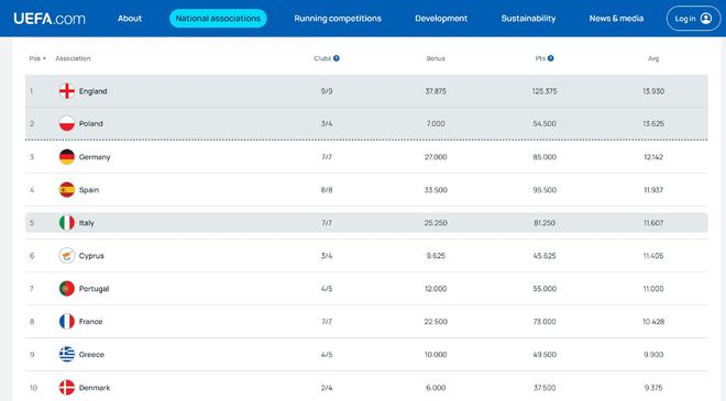 欧战系数平均积分:英超13.93分暂列第一,德甲第三西甲第四